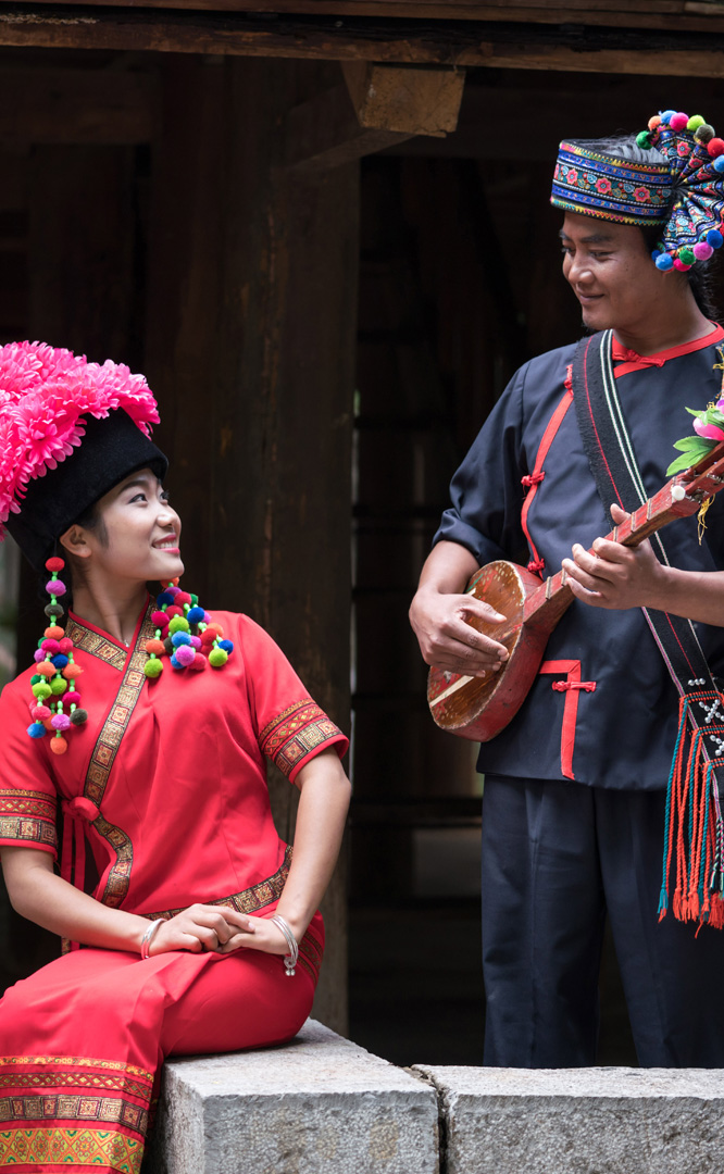 云南壯族主要聚居在文山州,人口114萬(wàn),民間的村寨大多依山傍水。壯族擅長(zhǎng)種植水稻,有太陽(yáng)崇拜和長(zhǎng)老崇拜的風(fēng)俗,視銅鼓為重器,厚愛銀飾,善烹制五色花米飯,能歌善舞,熱情好客。進(jìn)入景區(qū)壯族村,迎面有祭祀龍王的龍柱,兩邊是先民繪制的天王崖畫和為紀(jì)念傳說(shuō)洪水泛濫時(shí)幫助先民度過(guò)劫難而建的石葫蘆亭。祭祀玉皇大帝的昊天閣和傳說(shuō)能驅(qū)邪納福的碩大銅鼓聳立在廣場(chǎng)兩側(cè)。桿欄式和麻欄式民居、壯族青年社交休憩的“情廊”、村...
